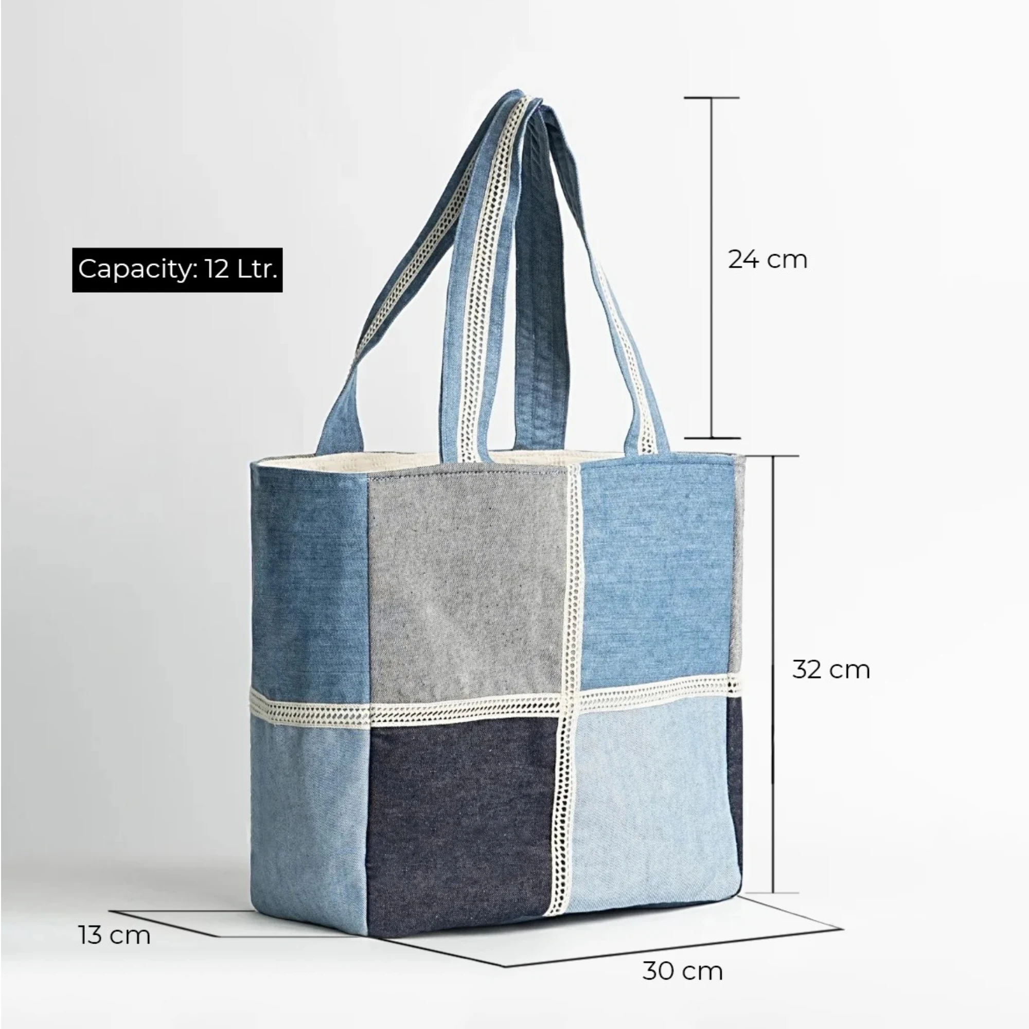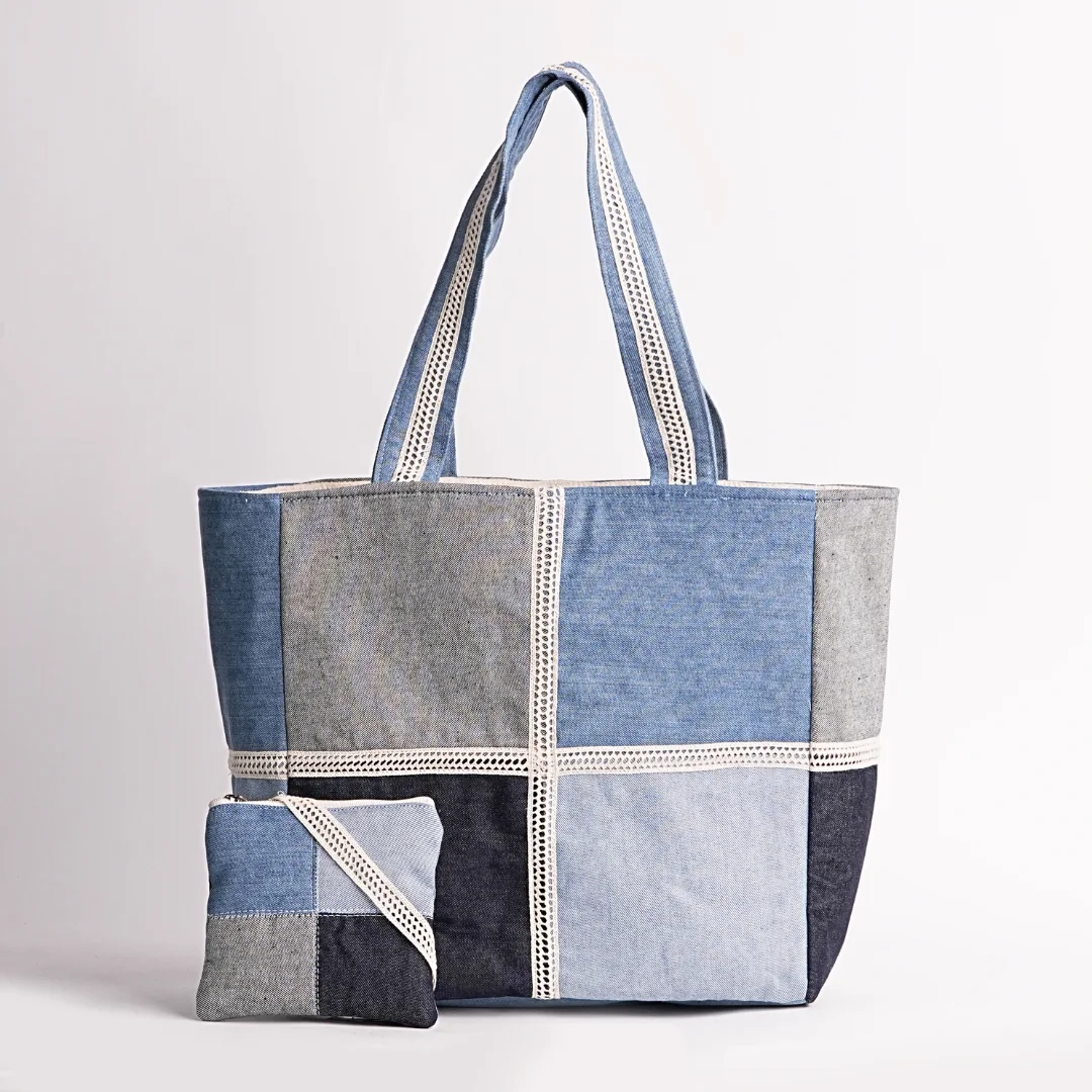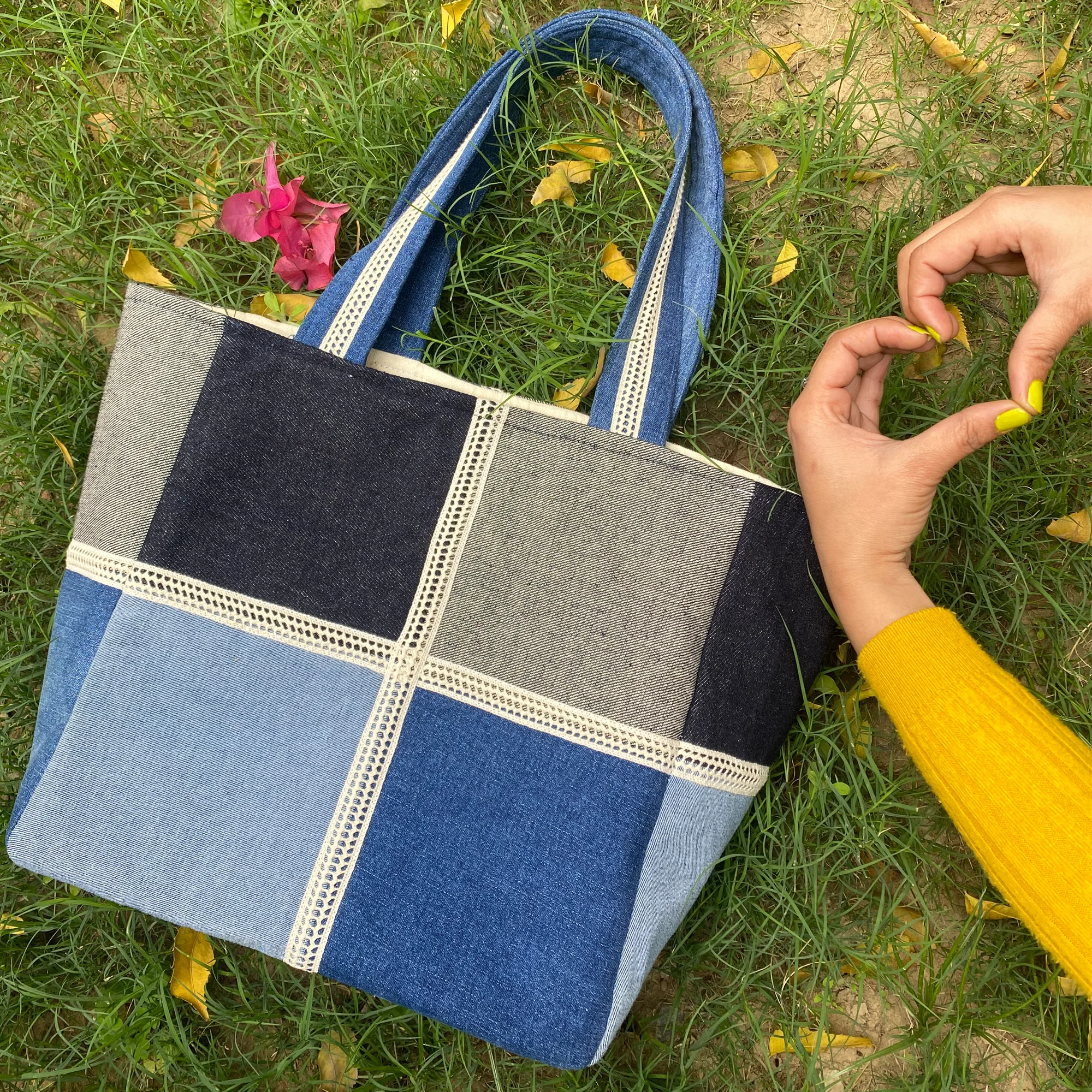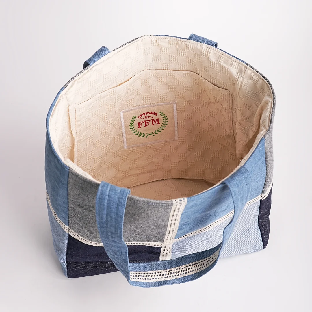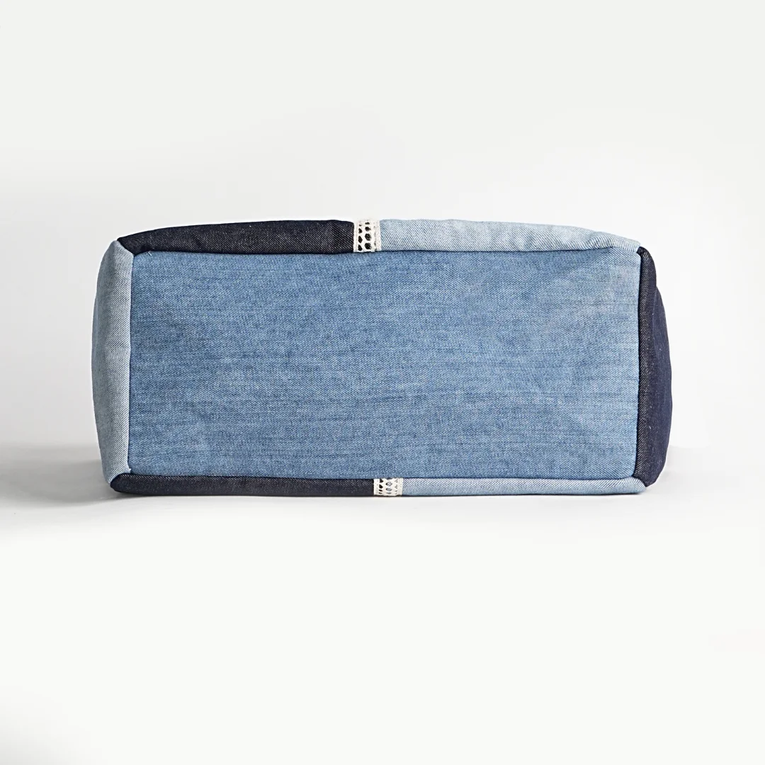 Crafted from responsibly sourced industrial denim, this tote features a distinctive patchwork design that gives unused fabric a bold second life.