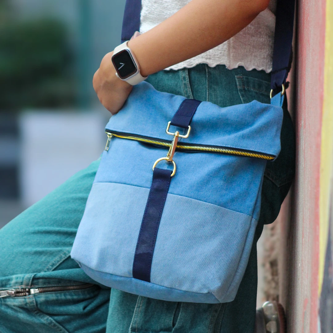 The Fold-Over Denim Messenger Bag combines sleek design with sustainability.