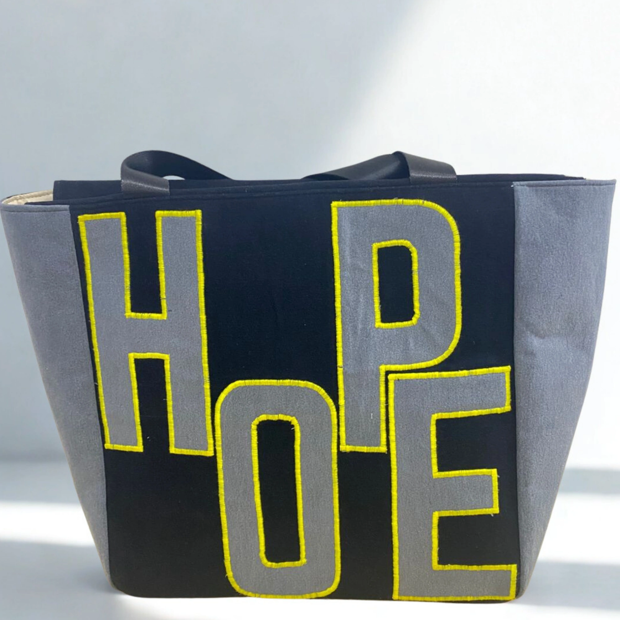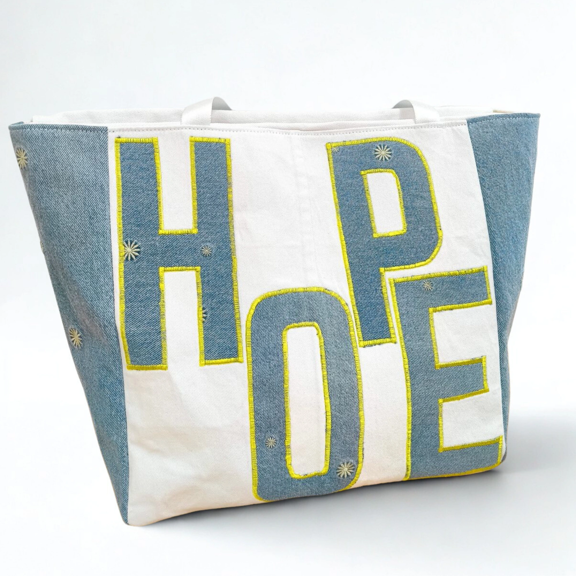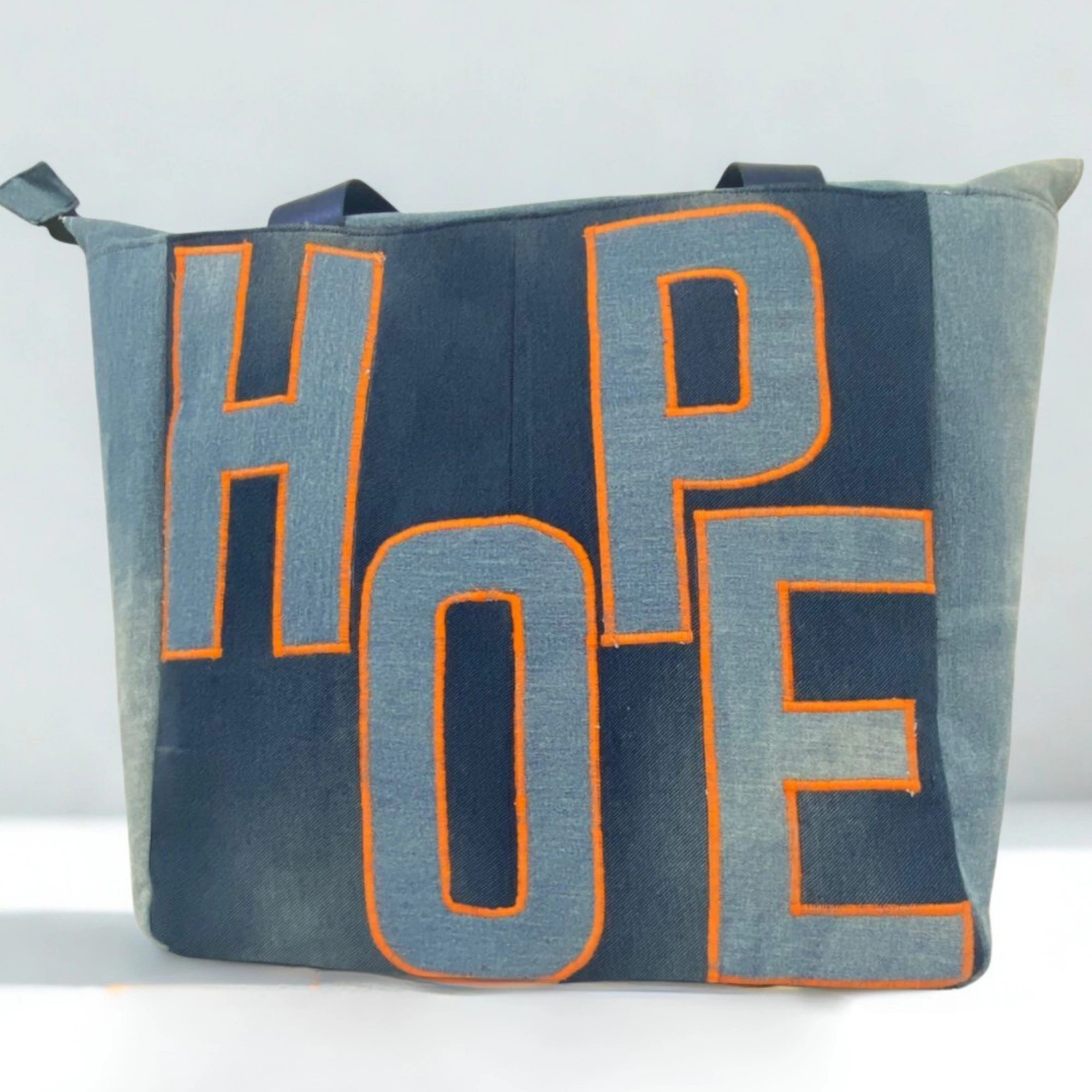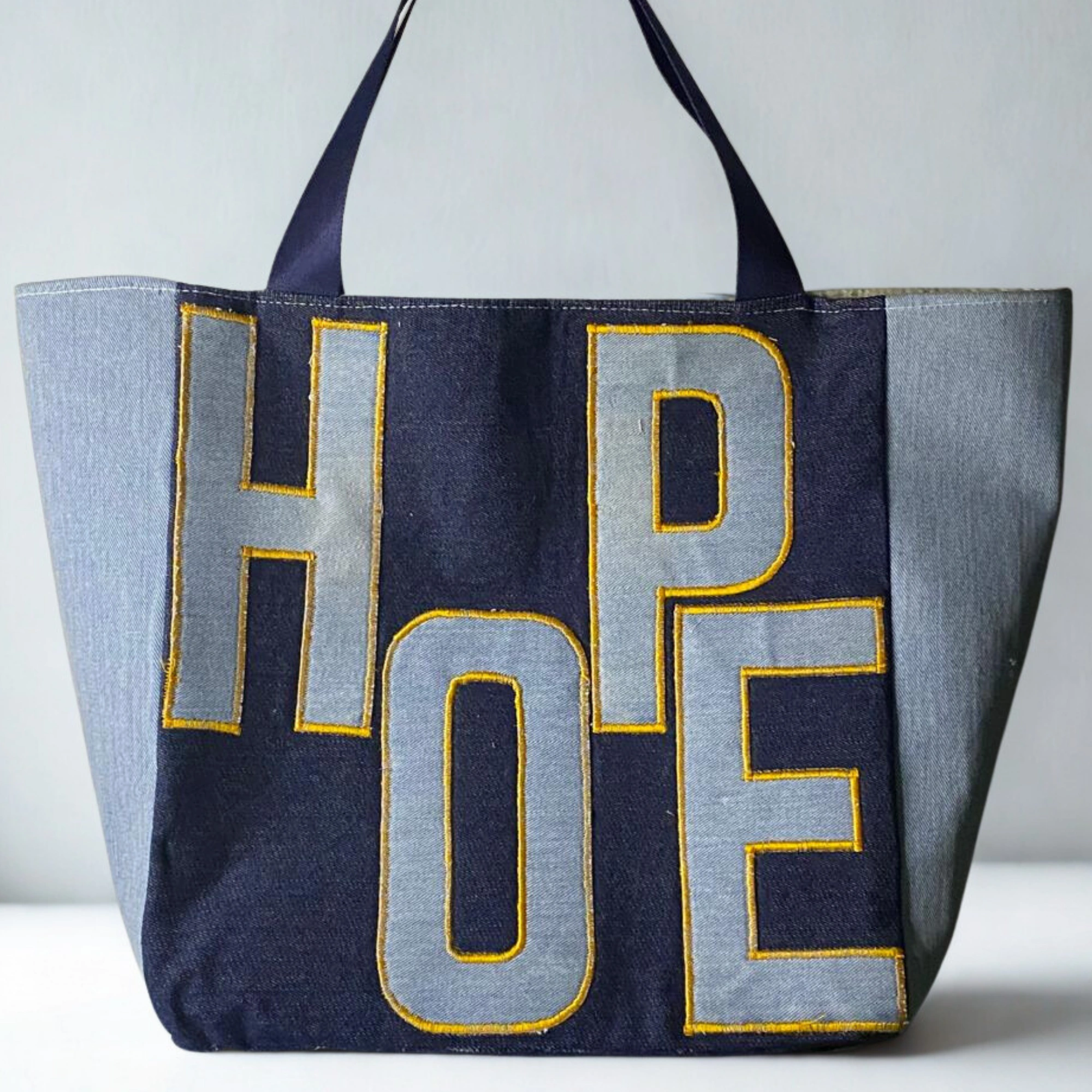 The Hope Tote is more than just an accessory — it’s a message you carry. Upcycled from two of your denims, this tote symbolizes optimism, resilience, and the power of second chances — both for fabrics and for people. Each letter of HOPE is individually cut and stitched with contrasting threads, representing strength through renewal.
